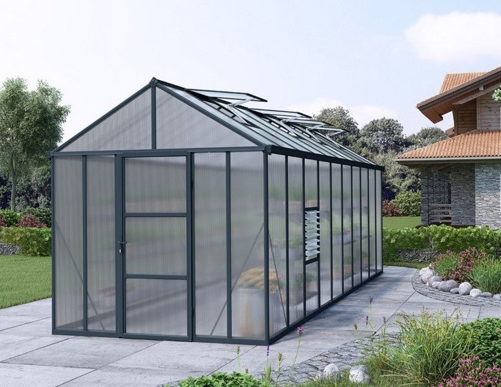 Jauhemaalatut antrasiitin alumiiniprofiilit tarjoavat tyylikkään ja ruosteenkestävän rakenteen. Seinät ja katot on valmistettu kestävästä 2-kerroksisesta kanavamuovista, joka eristää hyvin, suojaa haitallisilta UV-säteilyltä ja jonka valonläpäisy on 79 %. Kasvihuone seisoo tukevasti mukana tulevan galvanoidun teräspohjan ansiosta.