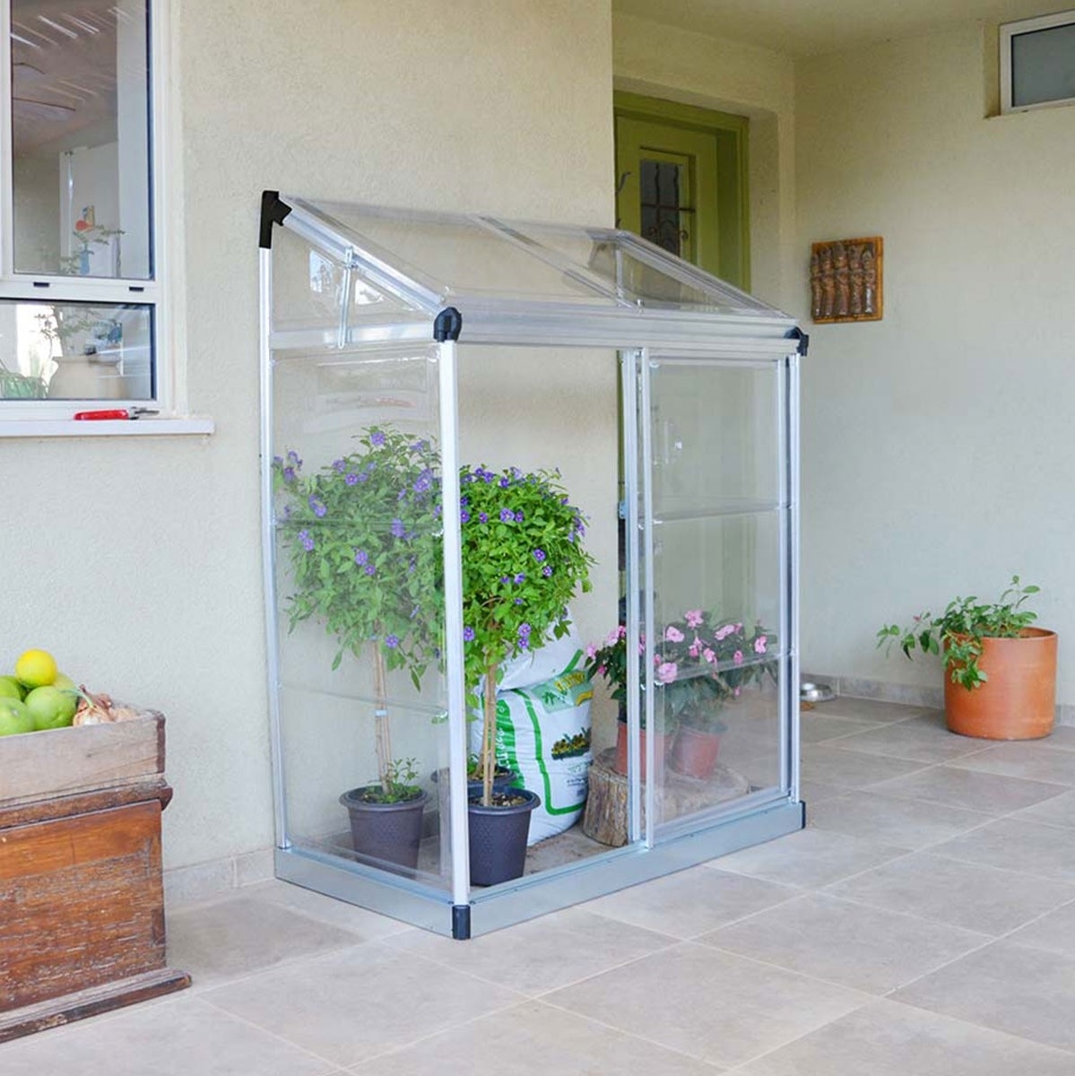 Parvekekasvihuone Lean on käytännöllinen pieni kasvihuone kasvusta kiinnostuneille, joilla on käytössään parveke tai pienempi pinta-ala. Sisusta kasvihuone hyllyillä, niin sinulla on tilaa sekä mausteille että tomaateille.