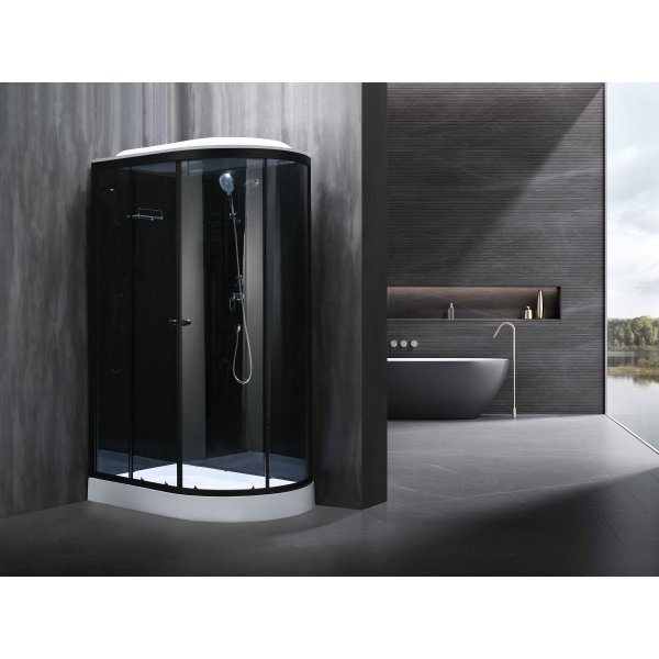 5 mm etulasi ja tyylikäs 4 mm musta takalasi luovat kylpyhuoneeseen eksklusiivisen tunnelman. Yksittäisten pyörien ansiosta ovet avautuvat ja sulkeutuvat sujuvasti, kun taas sekä käsisuihku että yläsuihku tarjoavat tasaisen ja miellyttävän veden virtauksen, joka parantaa suihkukokemusta.
