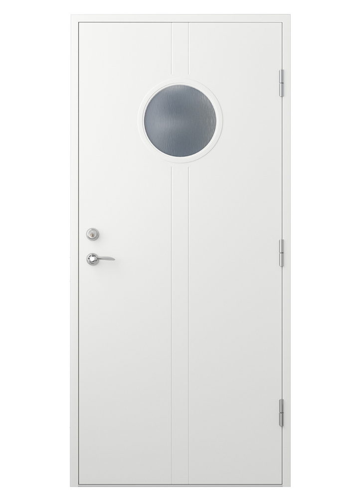 Ytterdörr Oknö on pyöreällä ikkunallaan hieman erilainen ja viehättävä. Uritettu kuviointi koristaa ovea ja kehystää ikkunan kaikessa yksinkertaisuudessaan. Ikkuna päästää sisään vähemmän valoa ja sen voi tilata joko kirkkaalla lasilla, Cotswold-lasilla tai himmeällä lasilla sen mukaan, haluatko yksityisyyttä.