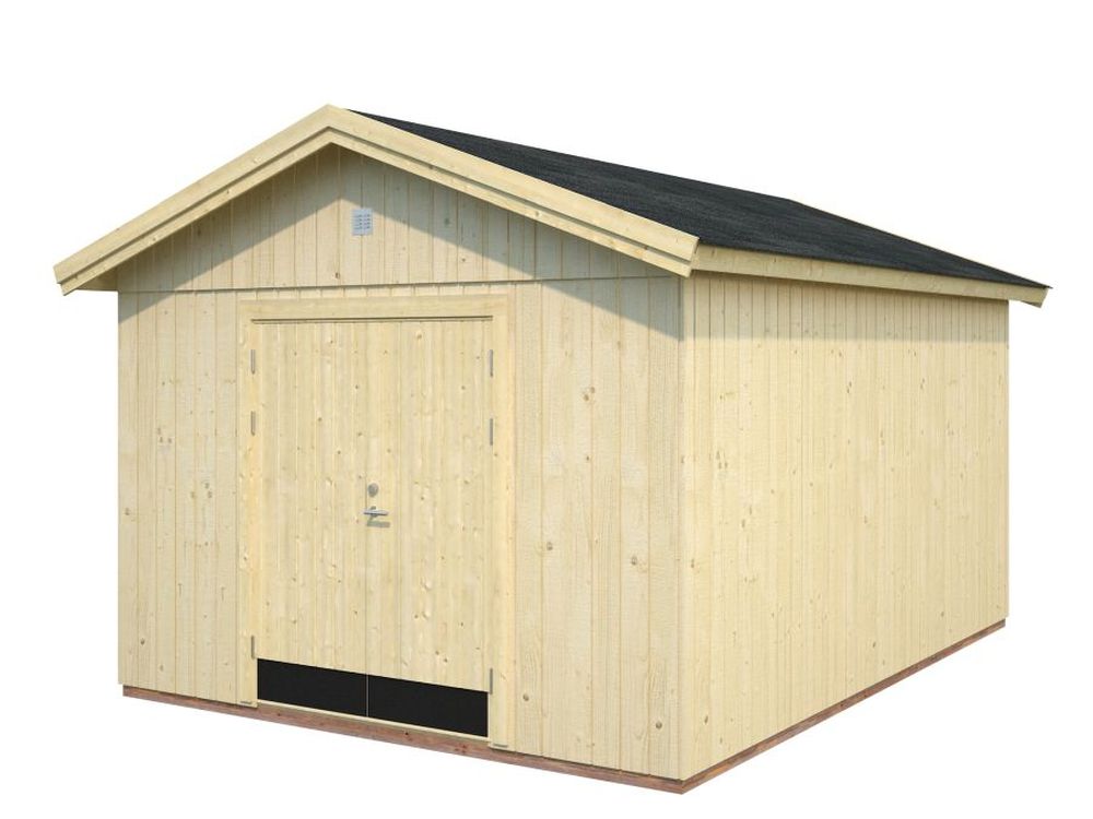 Seinät ja katto ovat limiölaudoista ja julkisivu valmiita seinäelementtejä ja tuulenpitävää muovia. Leveä pariovi helpottaa suurempien esineiden ohittamista ja on varustettu sylinterilukolla, potkulevyllä ja säädettävillä 3D-saranoilla.